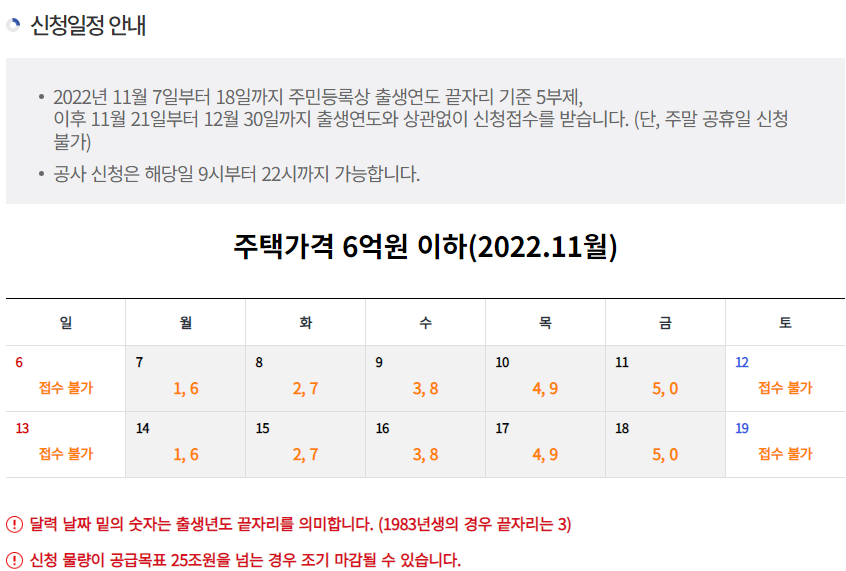 신청은 주택가격에 따라 신청 접수일이 조금 달라지며 아래와 같습니다.