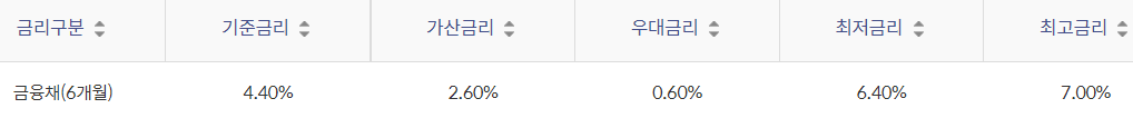 대출 금리는 기준금리 + 가산금리 - 우대금리를 최종 적용하며 아래와 같습니다.