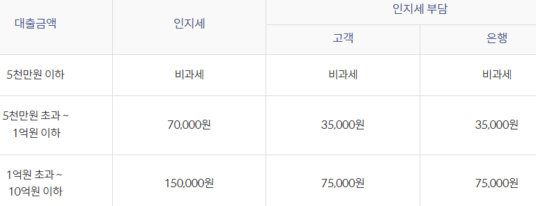 인지세란 대출 거래 신규 약정 시 내게되는 세금으로 대출 금액에 따라 위와 같이 세액이 차등 적용되며, 인지세는 은행과 고객이 각각 50%씩 내게 됩니다.