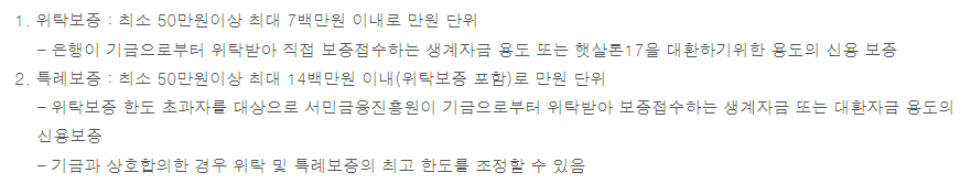 대출한도는 위탁보증이냐 특례보증이냐에 따라 아래와 같이 달라집니다.