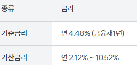 대출 적용 금리는 기준금리 + 가산금리를 최종 적용하며 현재는 최저 연 6.6% ~ 15%입니다.