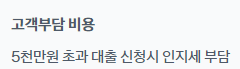 인지세란 대출 신규 약정 시 내는 세금으로 대출금액 5천만원 이하라면 비과세라 세금을 낼 필요 없으므로 사잇돌대출은 해당 사항이 없지만 일반 신용대출의 경우 5천만원 초과 시 7만원의 인지세, 대출금액 1억원 초과 시 15만원의 인지세를 내야 하며 이 인지세는 은행과 고객이 각각 50%씩 부담하게 됩니다.