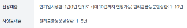 대출기간은 위와 같으며 신용대출은 만기일시상환 또는 원리금균등분할상환방법을 선택이 가능하며 사잇돌대출의 경우 원리금균등분할상환 선택만 가능합니다.