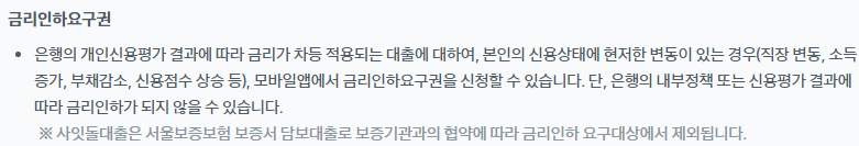 금리인하요구권은 사장님대출의 경우 가능하며, 사잇돌대출의 경우 금리인하요구권 대상에서 제외됩니다.(어차피 잘 해주지도 않아요,,ㅋㅋ)