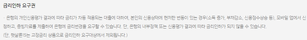 여기서 햇살론15의 경우 개인신용 및 소득이 낮아 대출이 어려운 분들을 위해 따로 만든 정부의 서민정책금융 상품으로 대출 진행 후 성실상환(1년간 누적 연체일수 30일 이하)자가 된다면 3년 상환 약정의 경우 1년마다 연 3%씩 금리 인하, 5년 상환 약정의 경우 1년마다 연 1.5%씩 금리를 인하 해주는 혜택을 주고 있습니다.