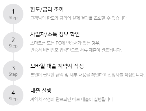 신청 후 금리 및 한도는 2~3분 내로 정해지며 대출금 입금 신청까지하면 대출이 진행되니 자신의 자금 필요상황을 잘 체크 후 사용하시길 바랍니다.