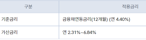 기준금리 + 가산금리로 최저 연 6.71% ~ 최고 연 11.24%입니다.