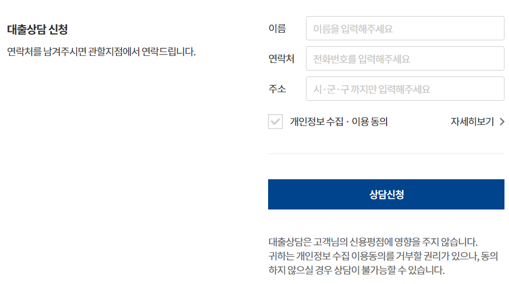 대출 상담신청은 아래 홈페이지에서 위 간단한 인적정보만 적고 상담신청이 가능하며 상담을 신청하면 전화상담을 진행합니다.