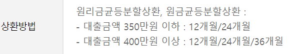 상환방법은 원금균등,원리금균등분할상환 두가지가 있습니다.