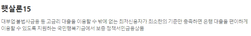 햇살론15는 이미 고금리 상품을 이용하고 있는 분들에게 대환자금 또는 생계자금을 지원해주는 상품입니다.