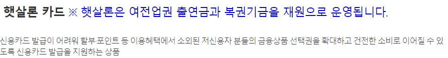 햇살론카드는 가장 잘 만들었다고 생각하는 서민정책금융상품 중 하나로 소득 및 신용이 낮아 신용카드 발급이 어려워 카드 혜택인 할인, 포인트 등 카드 혜택을 누리지 못하는 분들을 위해 신용카드 발급을 지원하는 상품입니다.