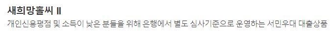 새희망홀씨는 은행에서 저소득 및 저신용자를 위해 별도의 심사기준을 마련해 우대하는 서민우대형 상품입니다.