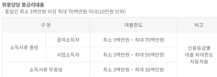 중금리신용대출은 소득서류 증빙 가능 일때와 무증빙일 때와 한도가 위와 같이 차이가 납니다.