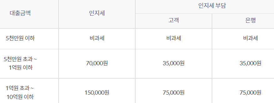 인지세란 대출 거래 신규 약정 시 내는 세금으로 대출금액에 따라 세액은 따로 적용되며 5천만원 이하까지는 비과세이며 은행과 고객이 각각 50%씩 부담합니다.