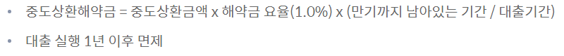 중도 상환해약금은 대출 실행 후 1년 이내 상환 시 해약금 요율1%가 수수료로 나갑니다.