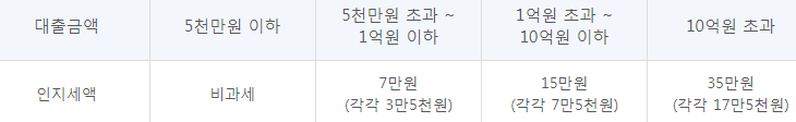 인지세란 인지세법에 의해 대출 약정을 체결 시 납부하는 세금으로 5천만원 이하는 비과세이지만 5천만원을 초과 시 대출금액에 따라 세액이 차등 적용되며 은행과 고객이 각각50%씩 부담합니다.