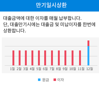 만기일시상환이란 말 그대로 대출기간 동안 이자만 내다가 만기일에 원금을 한번에 상환하는 방법입니다.