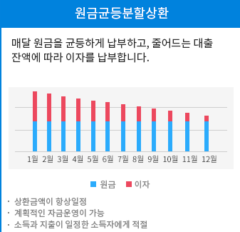 원금균등분할상환이란 대출원금을 대출 기간 동안 일정한 금액으로 상환하는 방법으로 이자는 줄어든 원금에서 계산하기 때문에 원금을 갚을수록 이자비용이 줄어든다는 장점이 있습니다.