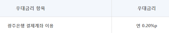 우대금리 0.2% 금리 조건은 추가약정 고객 대상으로 0.2% 우대를 해주며 우대금리 조건은 광주은행 결제계좌 이용입니다.