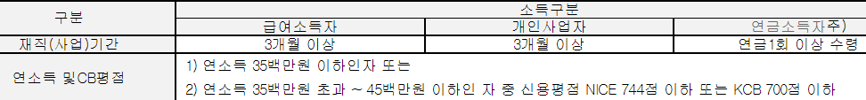 부산은행 새희망홀씨 대출은 소득 구분별 상세 자격요건은 아래와 같습니다.