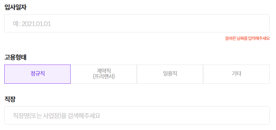 위와 같이 직장인인지 무직자인지 등에 대한 정보를 적고 직장인 등이라면 입사일자와 고용 정보 등 여러 정보를 입력합니다.