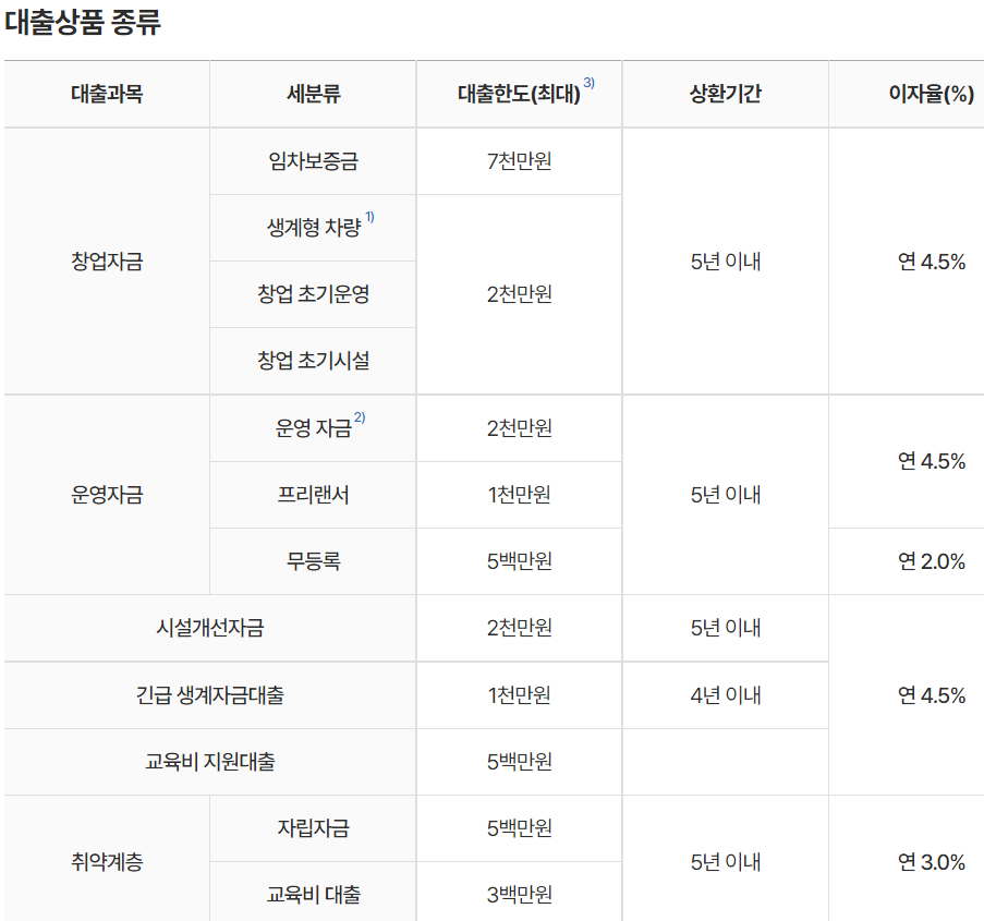 - 창업임차자금 : 창업예정인 고객에게 임차보증금의 70% 한도 내에서 지원가능