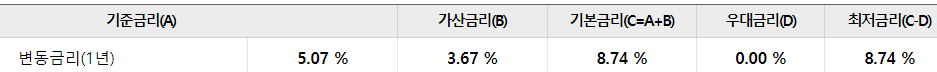 1년 변동금리 상품으로 기준금리 + 가산금리를 적용하여 최종적으로 적용합니다.