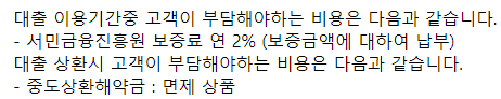 이 상품은 중도상환해약금이 면제인 상품으로 언제든 여유자금이 있다면 상환하시어 이자 비용을 아낄 수 있다는 장점이 있습니다.
