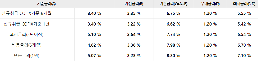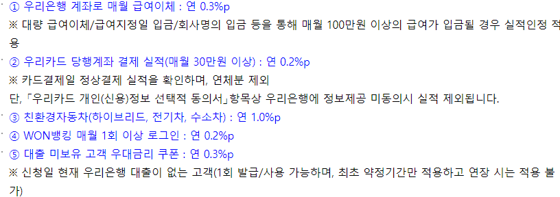 대출 최종 적용금리는 기준금리 + 가산금리 - 우대금리를 적용하며 우대금리 조건은 아래와 같습니다.