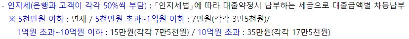 인지세 부분은 대출 신규 거래 약정 시 내는 세금으로 5천만원 이하까지는 비과세이며 대출금액에 따라 아래와 같이 인지세가 정해지며 이 인지세는 은행과 고객이 각각 50%씩 부담하게 됩니다.