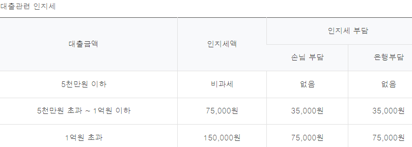 인지세란 인지세법에 의해 대출약정 체결 시 납부하는 세금으로 대출금액에 따라 세금이 차등 적용되며 은행과 손님이 각각 50%씩 부담하는 세금을 말합니다.