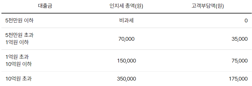 인지세란 대출거래 계약 체결 시 납부하는 세금으로 대출금액에 따라 차등 적용하며 인지세는 은행과 고객이 각각 50%씩 부담합니다.