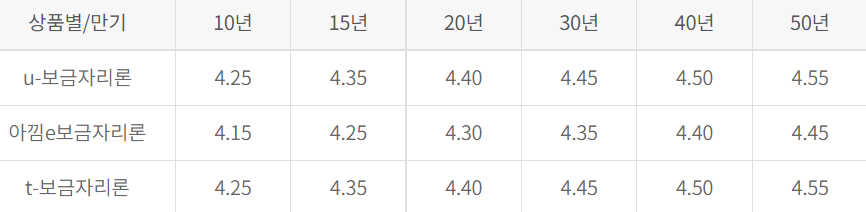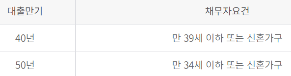 대출기간은 10년,15년,20년,30년,40년,50년까지 가능하지만 40년, 50년 만기의 경우 신청일 현재 채무자가 아래의 요건을 충족하는 경우에만 신청 가능합니다.