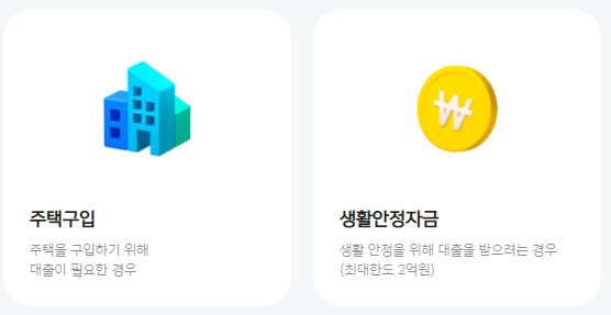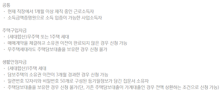 - 주택구입자금은 무주택 또는 1주택세대, 생활안정자금은 1주택세대만 가능
