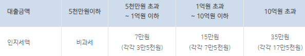 인지세란 대출 거래 신규 약정 시 내는 세금으로 5천만원 이하까지는 비과세이며 대출 금액에 따라 위와 같이 인지세가 차등 적용되며 인지세는 은행과 고객이 각각 50%씩 부담하게 됩니다.