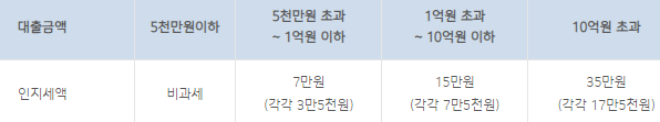 인지세란 대출 거래 신규 약정 시 내는 세금으로 인지세는 대출 금액에 따라 위와 같이 차등 적용되며 인지세는 은행과 고객이 각각 50%씩 부담하게 됩니다.