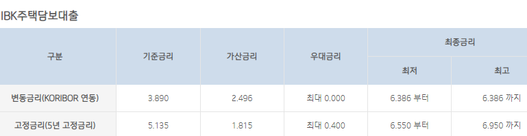기업은행 아파트담보대출 한도 및 금리