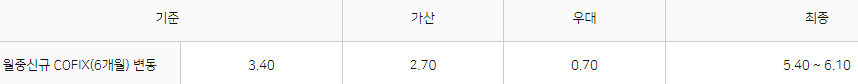 대출금리 산정은 기준금리 + 가산금리 - 우대금리를 최종 적용하며 아래와 같습니다.