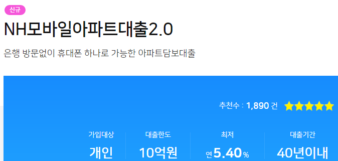 앱 설치 후 금융상품몰에서 NH모바일 아파트대출 2.0상품을 찾아 신청하시면 됩니다.