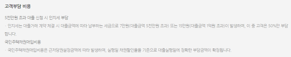 인지세란 대출 거래 약정 시 내는 세금으로 5천만원 이하까지는 비과세이지만 대출금액이 5천만원 초과일 경우 7만원 , 1억원 초과일 경우 15만원의 인지세를 은행과 고객이 각각 50%씩 부담하게 됩니다.