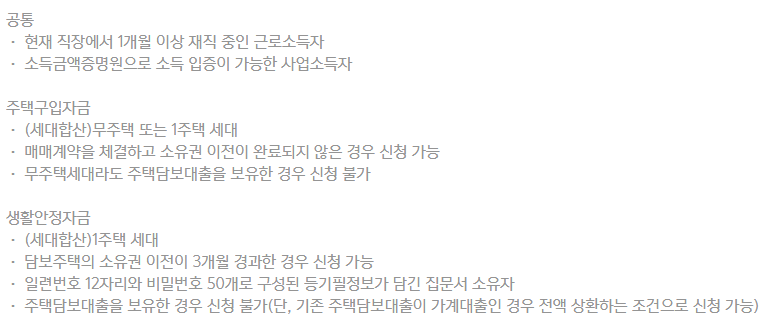 - 주택구입자금은 무주택 또는 1주택세대만 가능하며 생활안정자금은 1주택 세대일 경우 가능