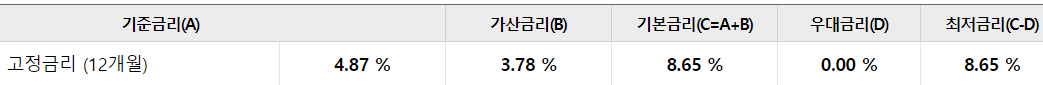 대출금리는 기준금리 + 가산금리를 적용하며 아래와 같습니다.