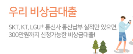 우리은행 비상금대출은 통신정보를 활용한 신개념 비상금대출로 통신 등급을 활용하여 무직자, 소득이 없어도 누구나 가능한 비상금대출입니다.