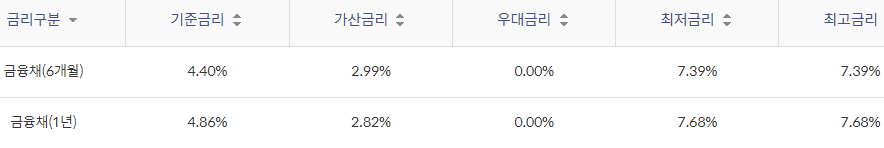 대출금리는 변동금리 6개월, 12개월 상품에 따라 달라지며, 아래와 같습니다.