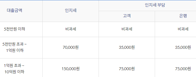 대출 진행 시 인지세라는 게 존재하며 인지세란 대출 거래 신규 약정 시 내는 세금으로 대출금액에 따라 위와 같이 인지세가 정해지며 이 인지세는 은행과 고객이 각각 50%씩 부담하게 됩니다.