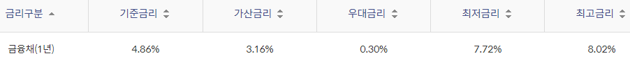 대출금리는 기준금리 + 가산금리 - 우대금리를 최종 적용하며 아래와 같습니다.