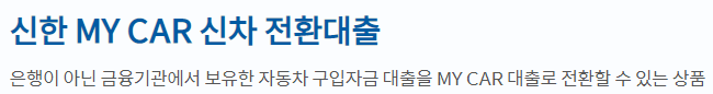 지금 소개해드릴 상품은 신한은행의 신차 전환대출 상품으로 다른 은행의 전환대출 및 자동차대출 상품이 궁금하신분들은 글 하단을 참고 하시길 바랍니다.