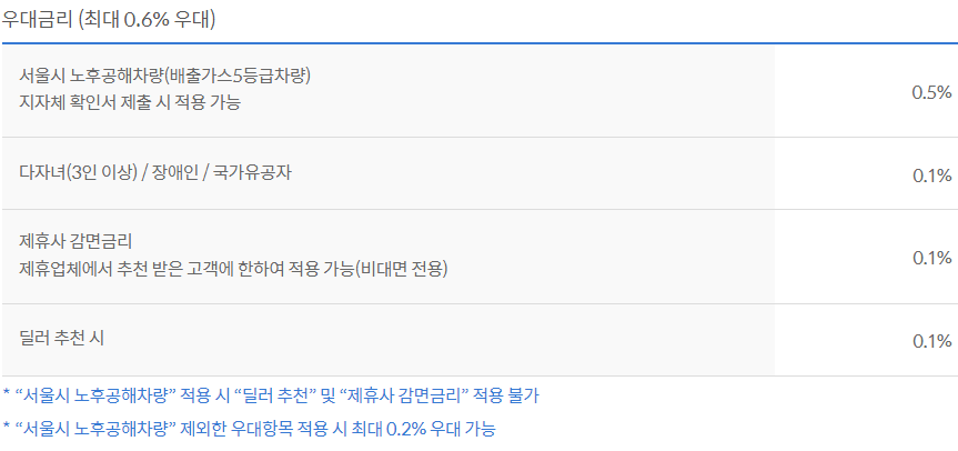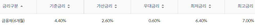 대출금리는 6개우러 변동 금리 상품으로 기준금리 + 가산금리 - 우대금리를 적용하며 우대금리 조건은 아래와 같습니다.