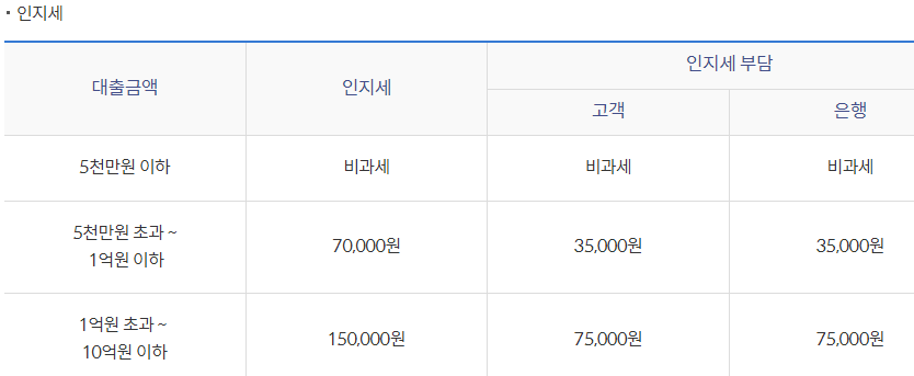 대출 진행 시 인지세라는게 존재하는데 인지세란 대출 거래 신규 약정 시 내는 세금으로 대출 금액에 따라 은행과 고객이 위의 인지세를 각각 50%씩 부담하게 됩니다.