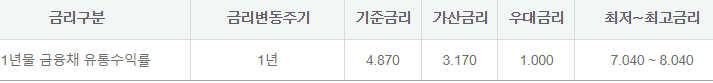 이 상품의 금리 산정은 기준금리 + 가산금리 - 우대금리를 적용하며 아래와 같습니다.